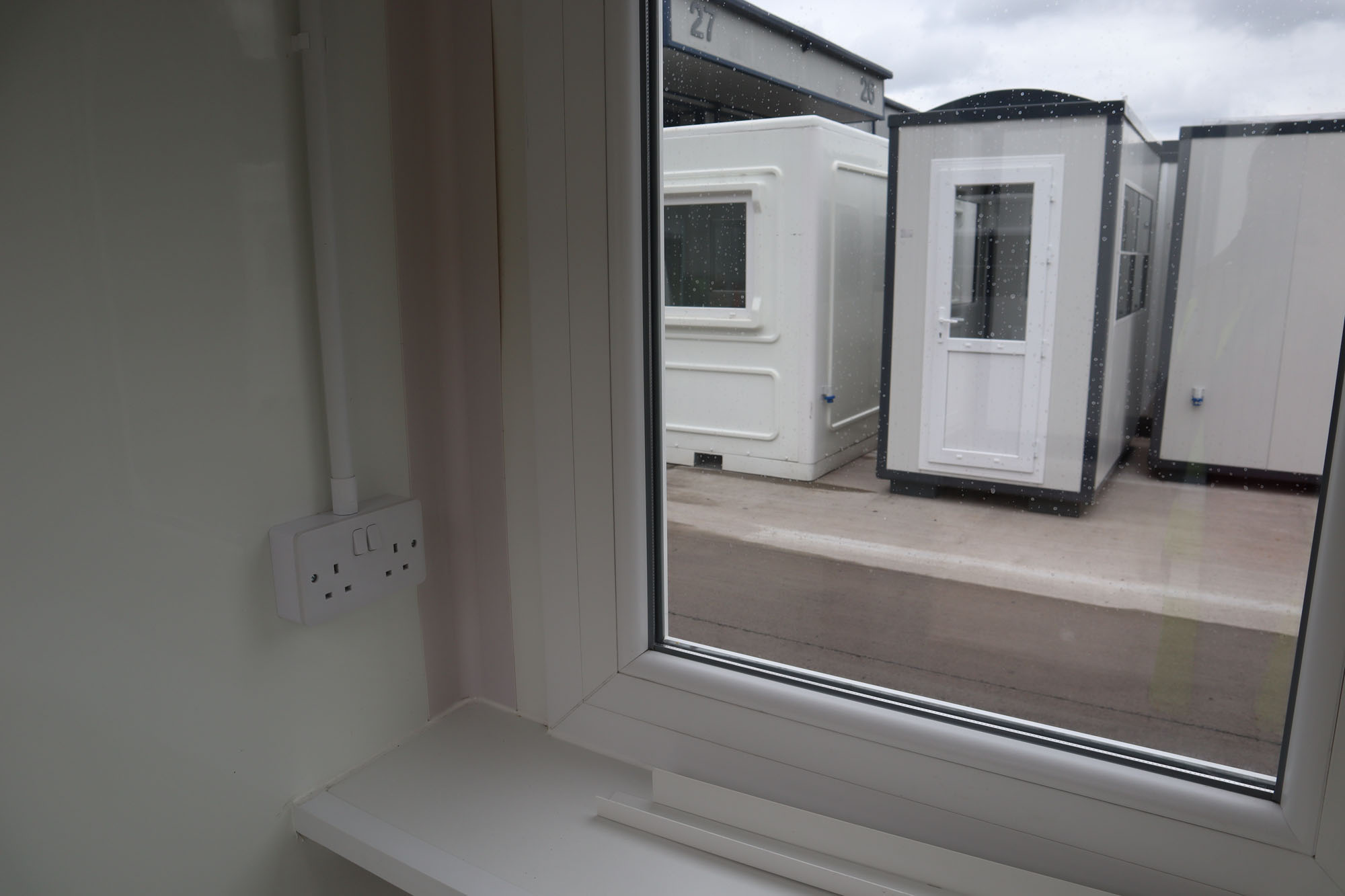uPVC double glazed windows and door. White semi-gloss exterior and interior finish on a molded metal frame base with fork pockets.